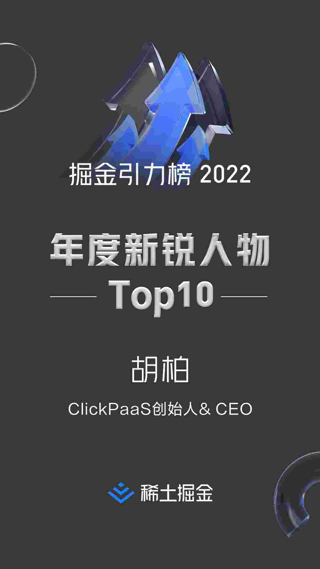 2022年1月6日,,稀土掘金社区第一届「掘金未来大会」成功举办,,,,会上发布了“2022 稀土掘金引力榜 年度新锐人物”榜单,,,上海爱湃斯科技有限公司(简称CGPAY钱包)创始人及CEO胡柏实力入选年度新锐人物TOP 10。。。。